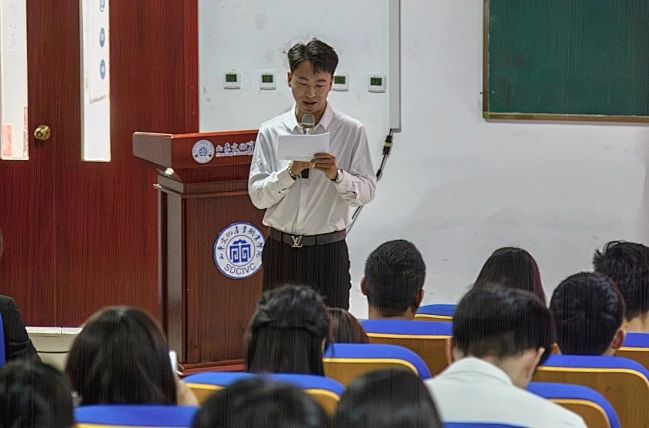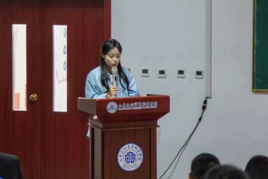 获奖代表李心茹同学发言,她分享了参与活动的感悟,表示通过叠被大赛培养了自律习惯,微视频大赛锻炼了专业能力,各项活动提升了团队协作与沟通能力,感谢学校搭建的成长平台。