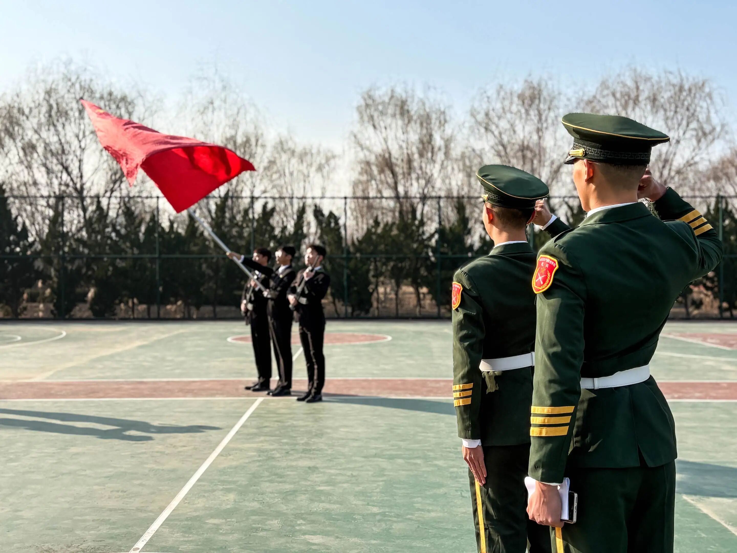 全体起立,迎国旗入场,全体人员面向国旗肃立并行注目礼,向国旗致以最崇高的敬意。