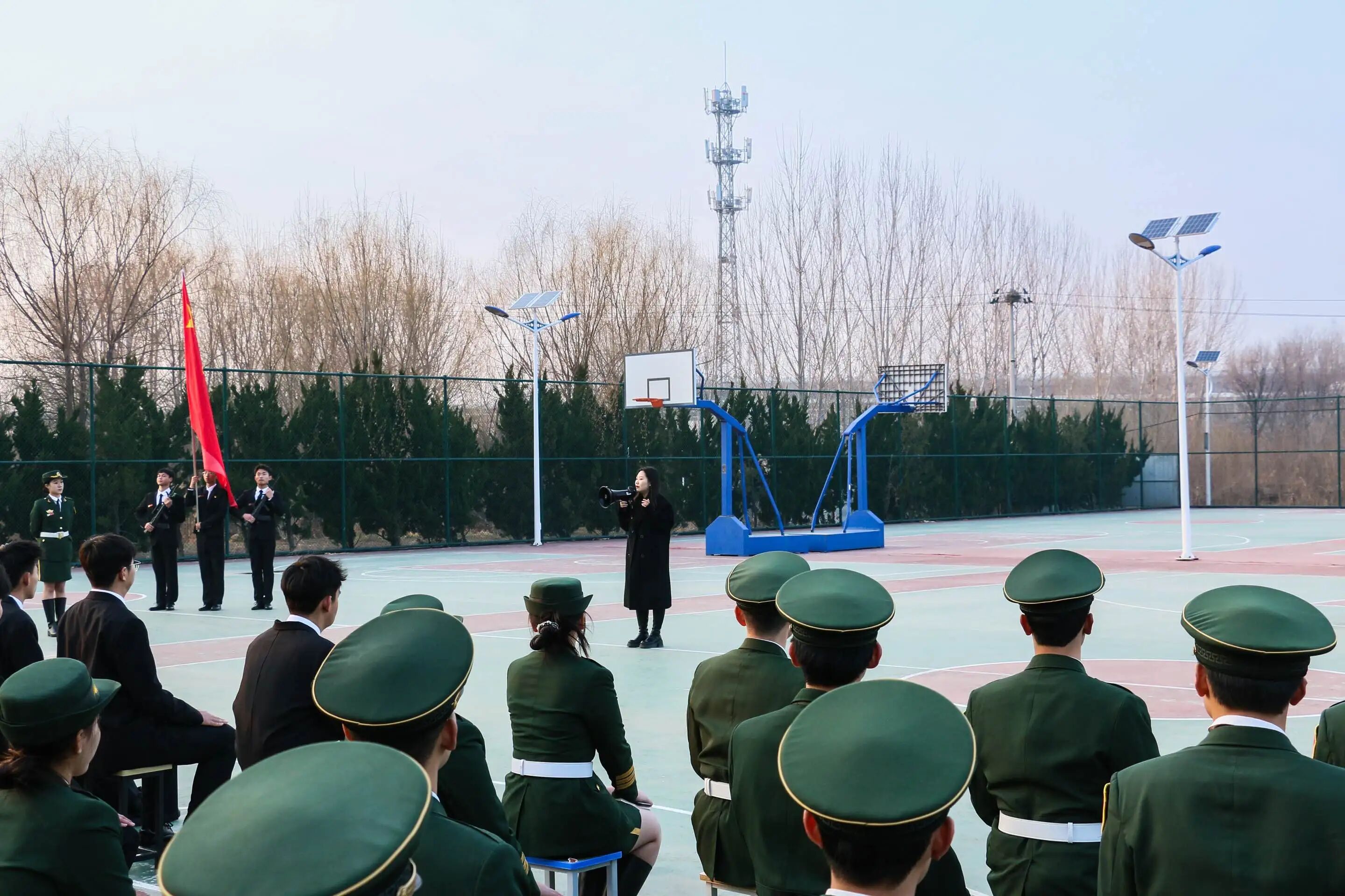 第二项议程有序推进,全体人员肃立,庄严奏响中华人民共和国国歌,铿锵旋律响彻篮球场,每一个音符都凝聚着队员们对国旗的赤诚与敬意。