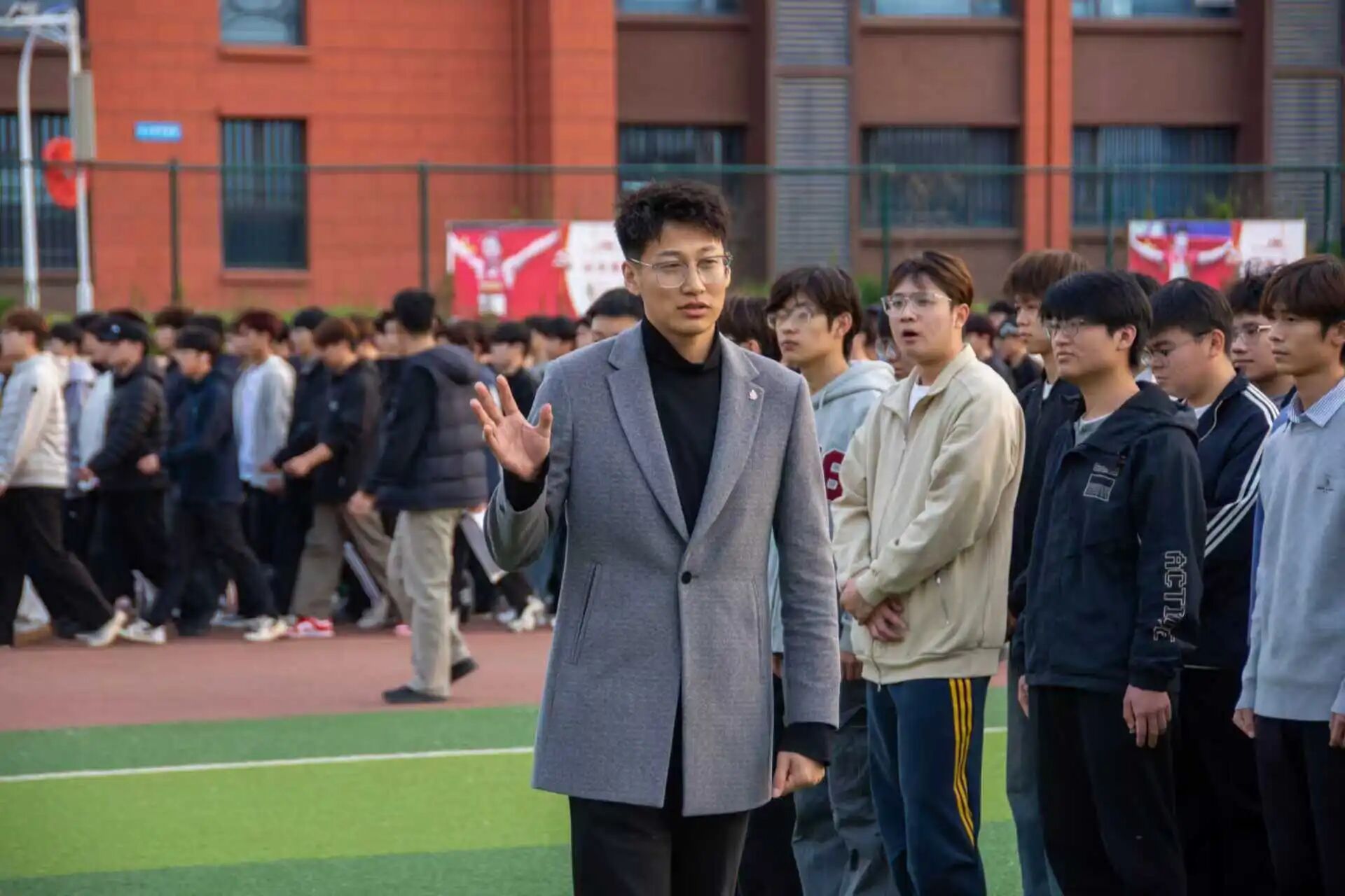 训练场上,不仅有同学们整齐的步伐,更有老师们悉心指导的身影。为了让方队展现出最佳风貌,老师们全程陪伴、耐心示范,从队列站位到摆臂幅度,从行进节奏到精神面貌,逐一纠正、细致讲解,让整个方队愈发整齐有序、气势昂扬,为即将到来的春季运动会入场式筑牢最美底色。